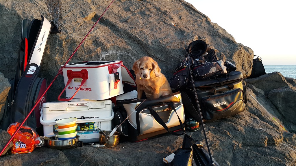 멸치배 지나가면서 너울파도 일어나 바닷물에 젖은 텐트 갯바위 위쪽으로 이동하여 설치
