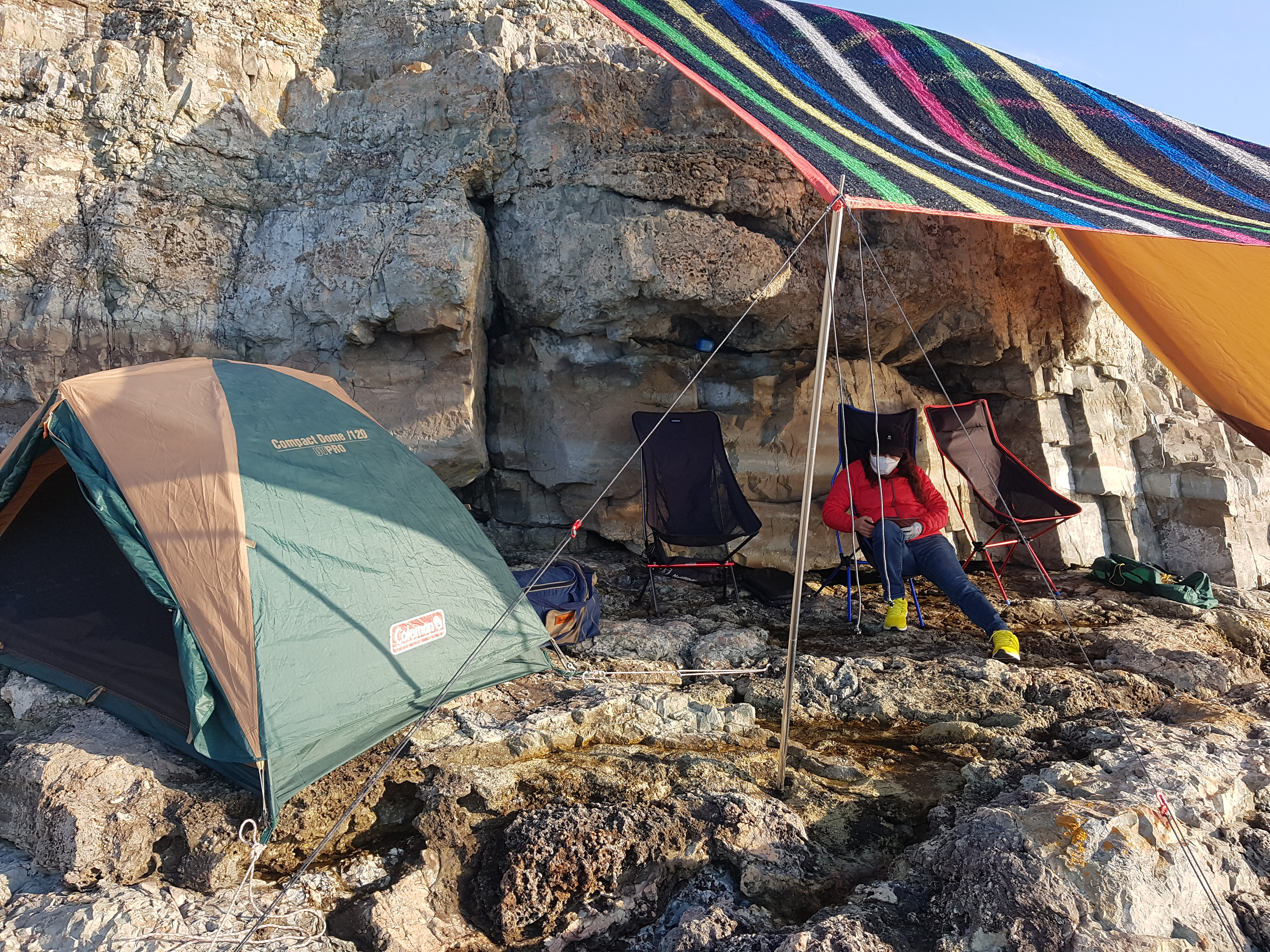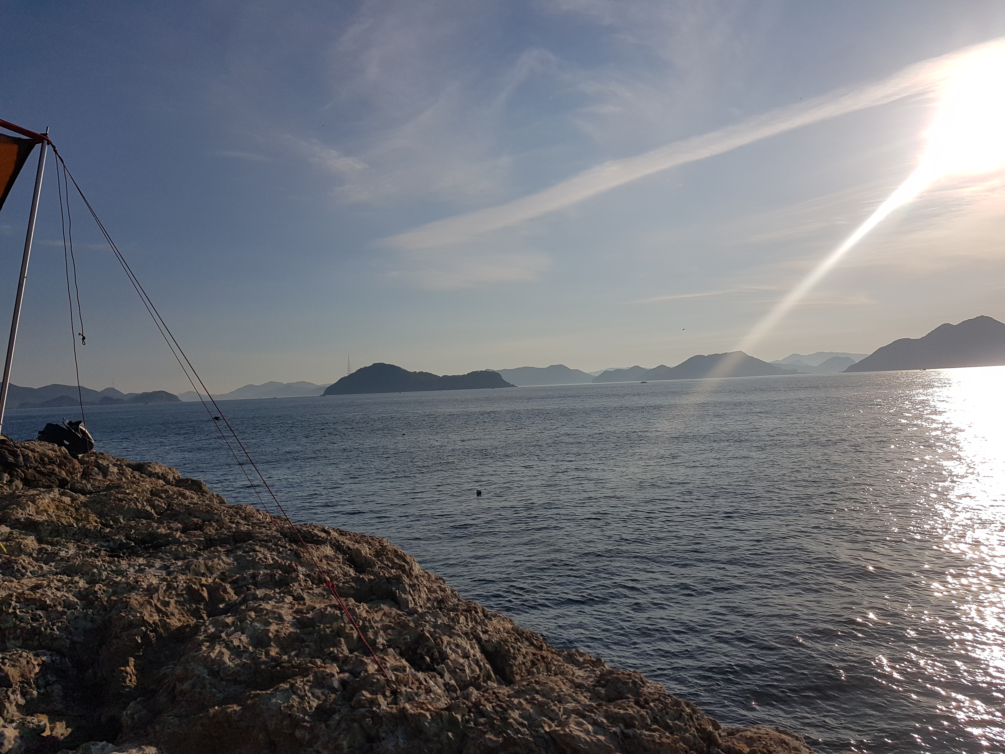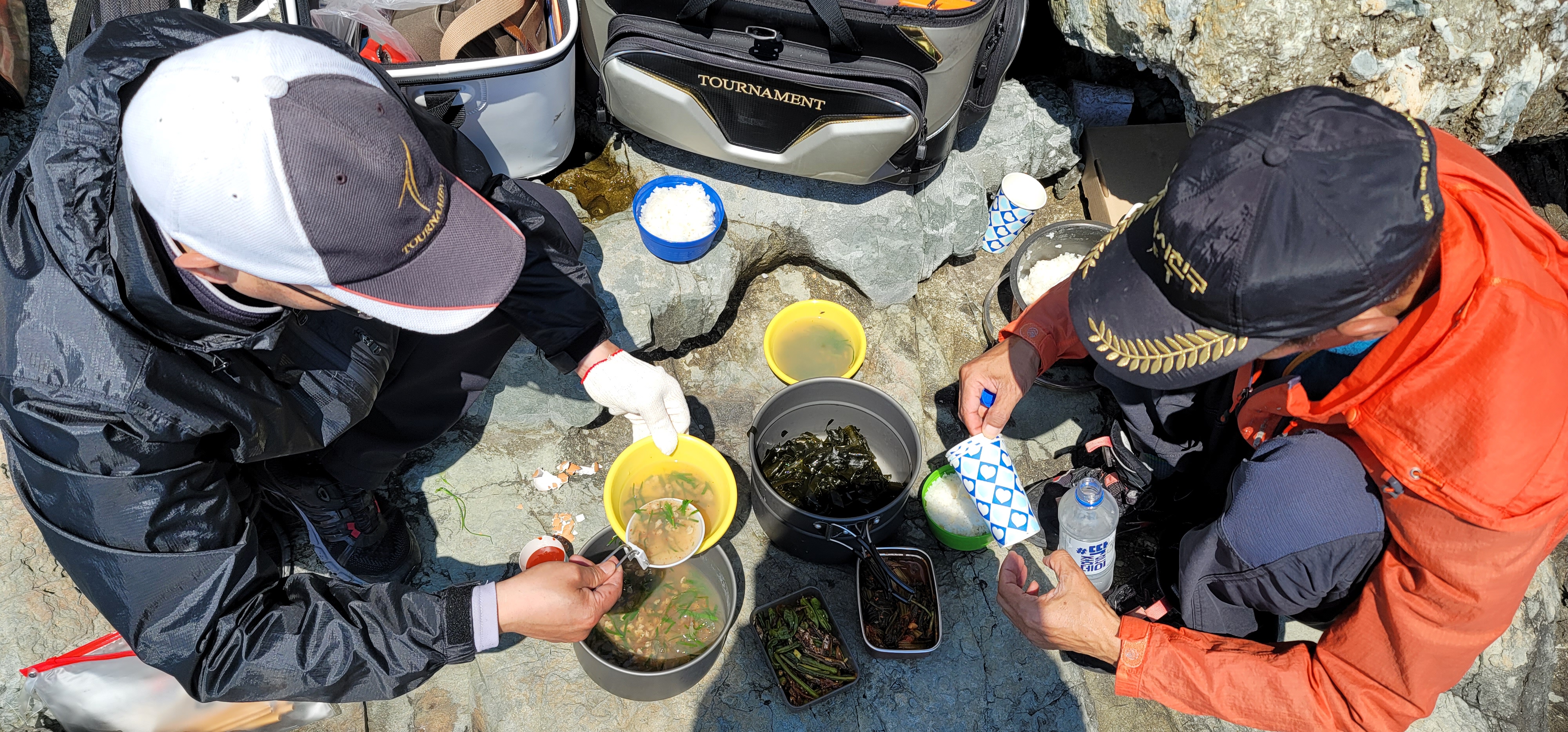 일단 배에서 장비들 내리고 다시 위쪽 갯바위 까지 야영 장비를 옮기는데.